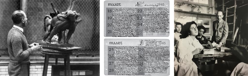 Eén van die kunstenaars is de beeldhouwer Jaap Kaas (1898-1972). Hij stond al voor de Tweede Wereldoorlog bekend om zijn tekeningen en beelden van dierfiguren, vaak in levenden lijve door Jaap Kaas bestudeerd in Artis. Als Joodse kunstenaar werd hij in 1941 echter ontslagen uit zijn functie als leraar aan het Instituut voor Kunstnijverheidsonderwijs. Daarom besloot hij les te gaan geven aan de Middelbare Joodsche Kunstnijverheidsschool W.A. van Leer. Toen deze opleiding door de vele deportaties uiteindelijk ook moest worden opgeheven in 1943, zag Jaap Kaas zich genoodzaakt zijn geliefde Amsterdam te ontvluchten en met zijn vrouw onder te duiken in Rotterdam. In deze periode hield Kaas een dagboek bij op een weekkalender, waarop hij door de geringe ruimte in steekwoorden bijhield hoe hij de vreselijke oorlog en hongerwinter ervaarde. Dit dagboek met unieke oorlogsbelevenissen bevindt zich in het archief dat is ondergebracht bij het RKD, evenals het bewijs van Kaas’ aanmelding bij de Joodsche Raad in 1941, een tegoedbon voor een Levensmiddelenpakket, voedselbonnen, correspondentie en zijn Davidster, te zien op een gefotografeerd zelfportret uit 1941. In het kader van dit digitaliseringsproject zullen deze archiefstukken met ooggetuigenverklaringen uit de Tweede Wereldoorlog worden gedigitaliseerd.